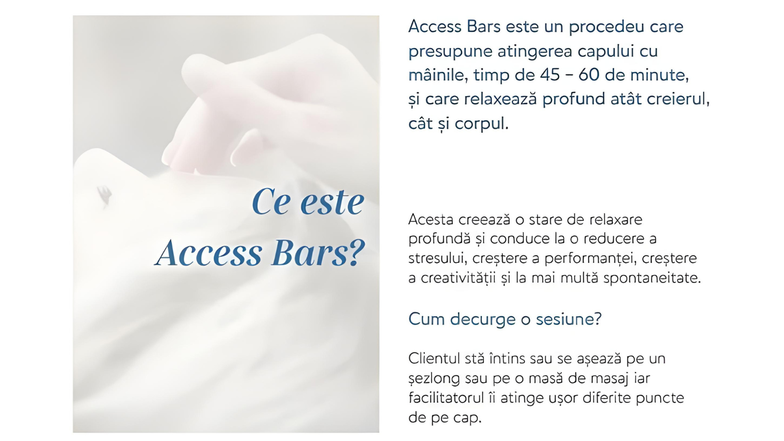 ACCES BARS este un proces energetic pentru corp, minte si suflet, ce conține 32 de puncte (bare de energie) pe cap, care atunci cand sunt atinse usor, încep să elibereze limitările legate de diferitele aspecte ale vieții noastre.