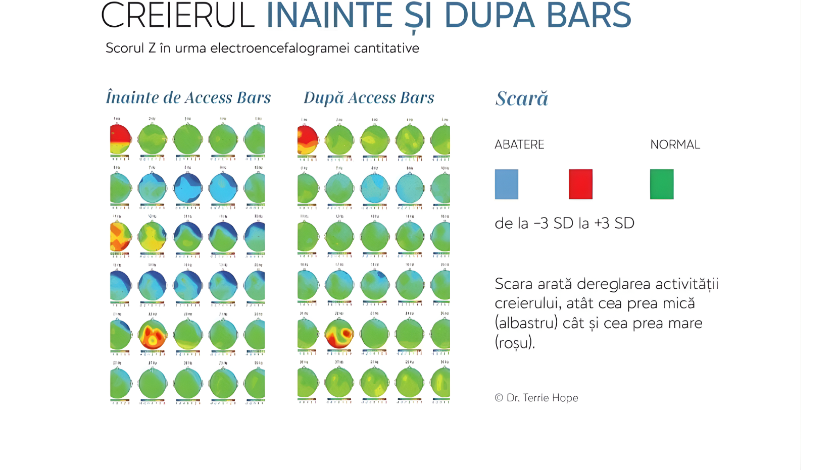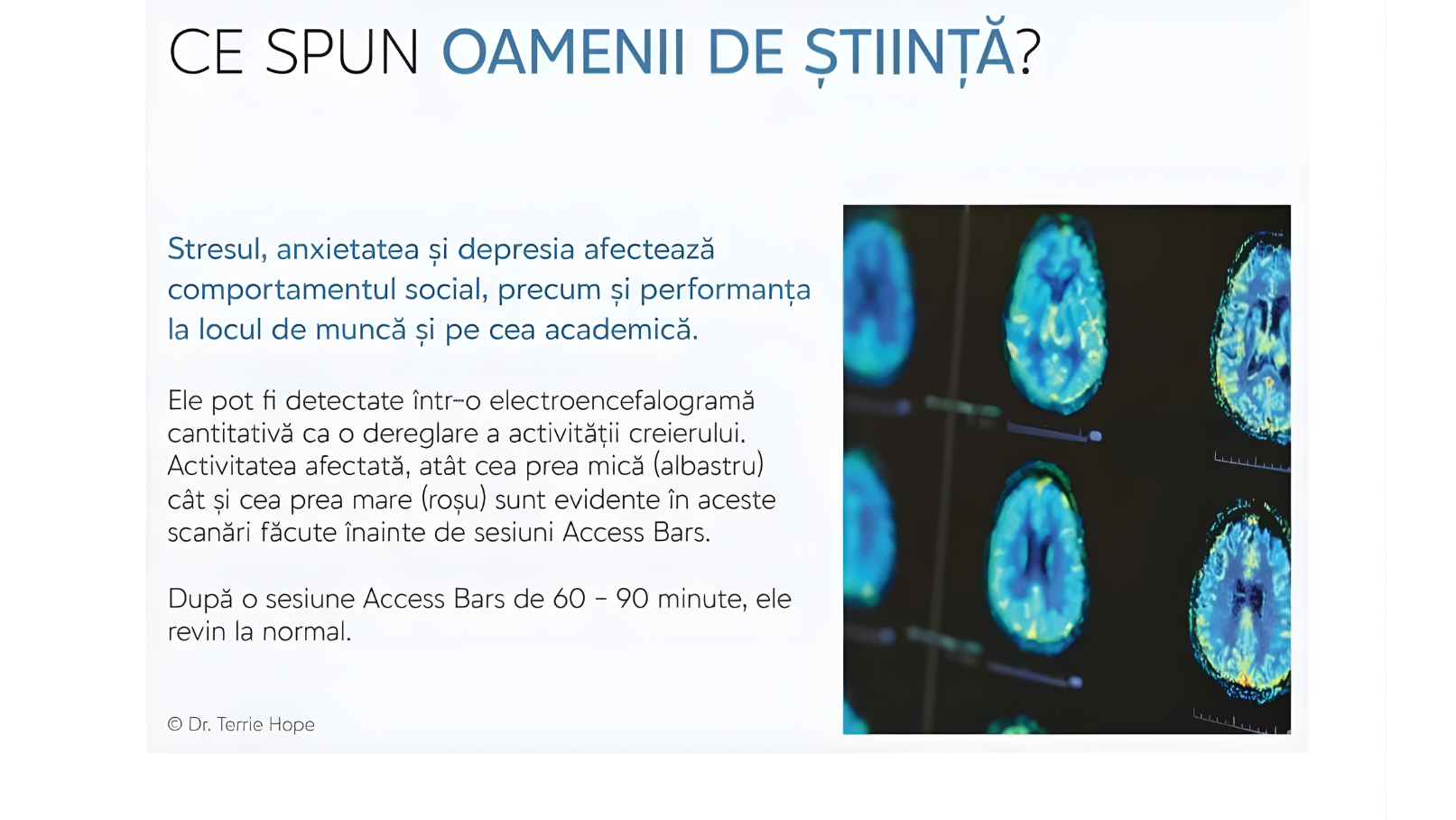 Din rezultatele a patru chestionare științific valide, standardizate și prin măsurarea modelelor undelor cerebrale folosind cartografierea cerebrală, (QEEG), Dr. Hope a descoperit în cadrul studiului său că Access BarsⓇ au redus severitatea simptomelor anxietății cu 84,7% (medie).
